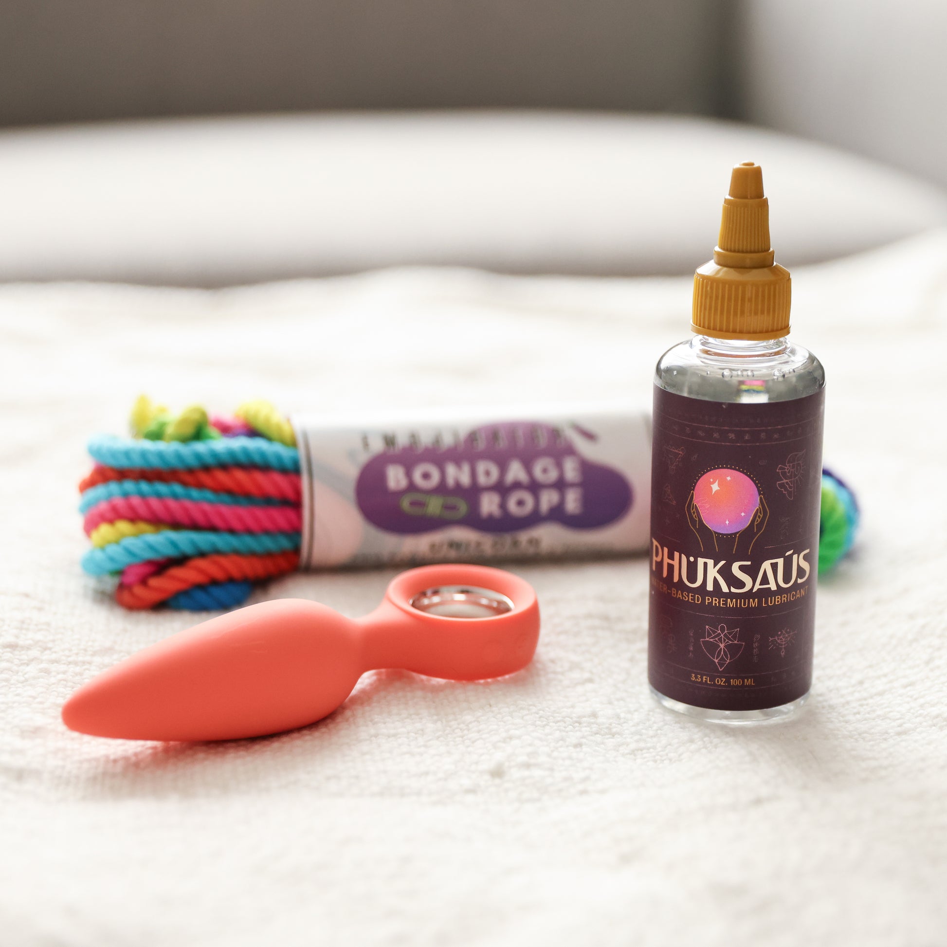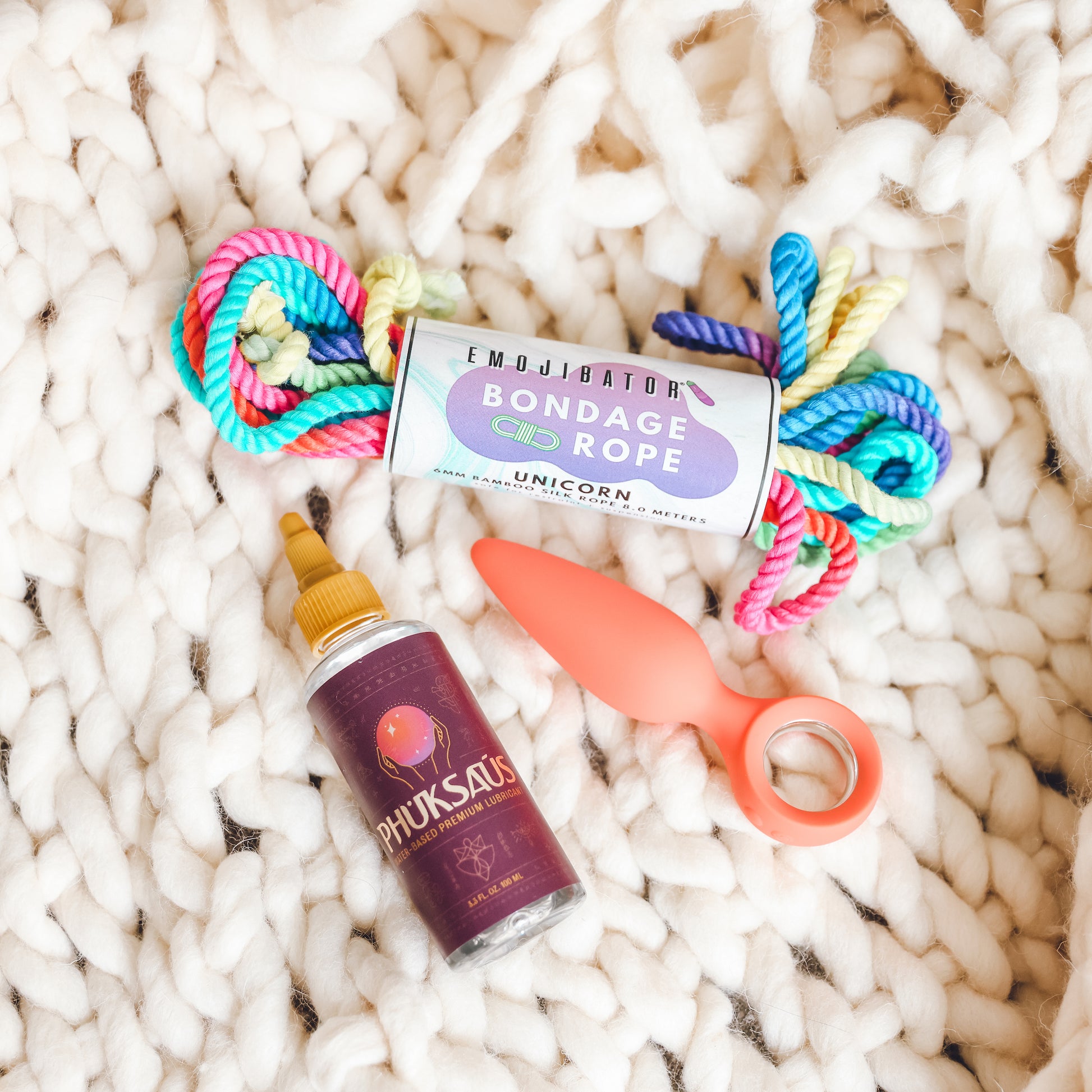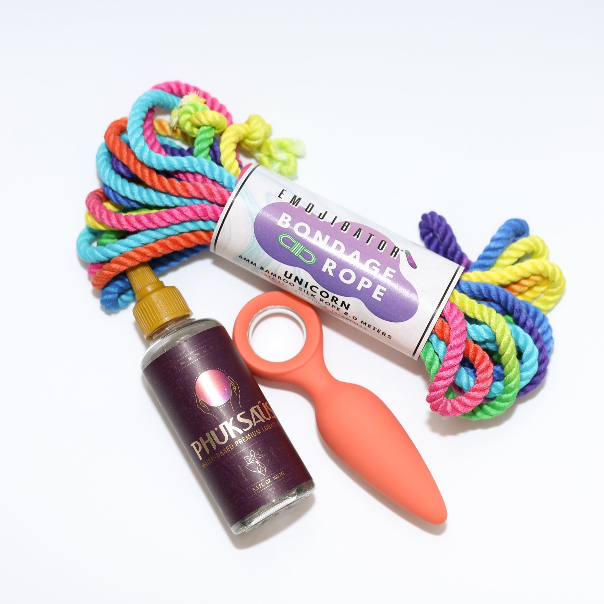 Turn the pleasure up and unlock our Intro to Kink bundle. Perfect for experienced kinksters or those experimenting with bondage and anal play for the first time. This set features Orville Anal Vibrator, Unicorn Rainbow Bondage Rope, and Phuksaus Water-Based Lubricant.